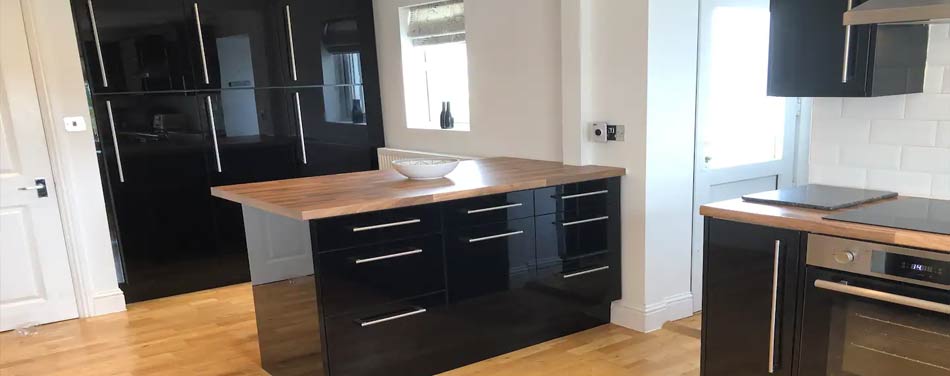 There are stylish hi-gloss black fitted floor and wall units, of contemporary fashion and with stainless steel detail.