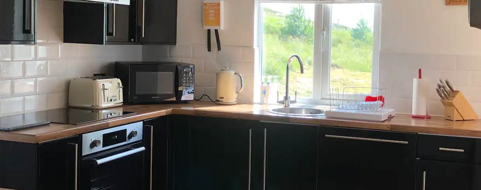 All that’s backed up by an additional microwave oven, Morphy Richards electric kettle and toaster in cherry red and a Cookworks electric slow-cooker. (You can toss the meat and veg in after breakfast and come home, many hours later – perhaps after an expedition to Harris – to enjoy a fragrant casserole.)